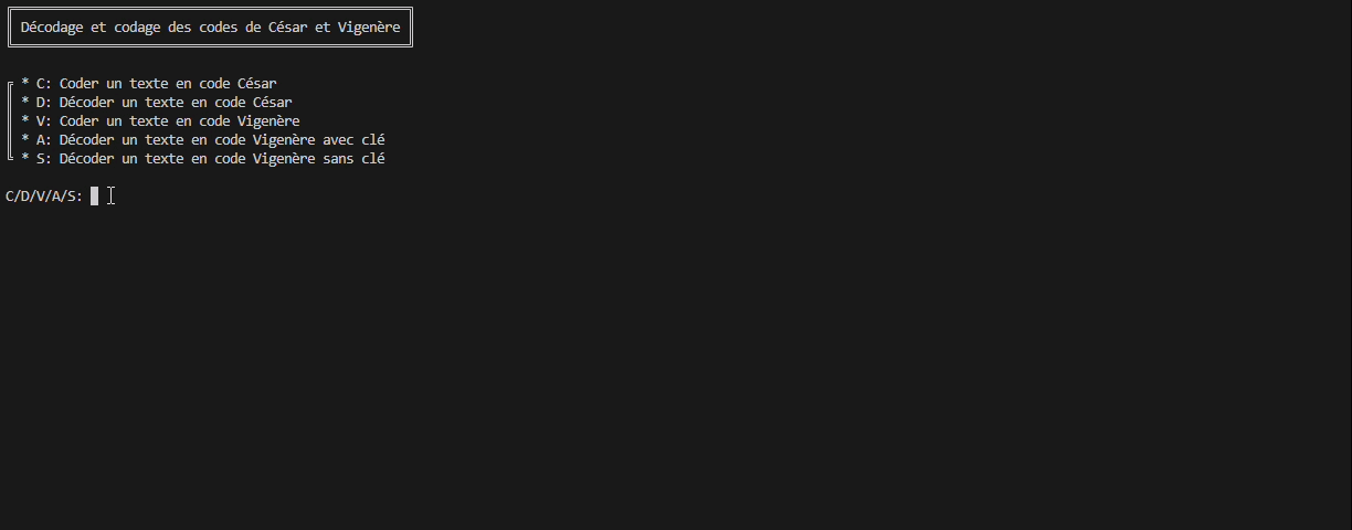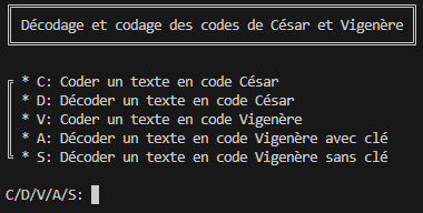 En lançant le projet, une chouette interface apparaît, et on peut choisir le type d'action en écrivant la lettre correspondante. Le "Décoder du code César" se base sur la langue française. En gros, il teste les 26 combinaisons possibles, et il regarde si l'un des essais décode un texte français.