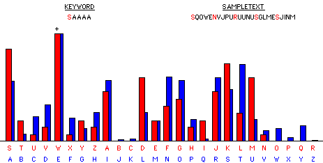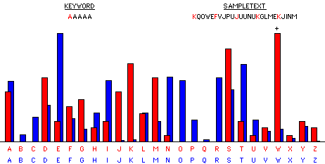 Quand on sait la longueur de la clé, on peut découper le texte en plein de morceaux de la longueur qu'on vient de découvrir. On prend pour commencer toutes les 1ères lettres de chaque partie. On regarde leur répartition, et on les mets dans un tableau. Comme toutes les lettres sont des lettres codées avec la même lettre de la clé, alors leur répartition sur un graphique (en rouge) peut être vu comme un décalage de la répartition de base (en bleu).