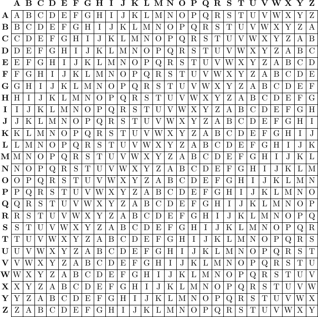 Avec ce tableau, on peut prendre la colonne de la lettre à coder, la ligne de la lettre de la clé, et on obtient la lettre chiffrée. Pratique, car pour bruteforce ça ça prend des centaines d'années ('fin jsp mais beaucoup quoi ^^').