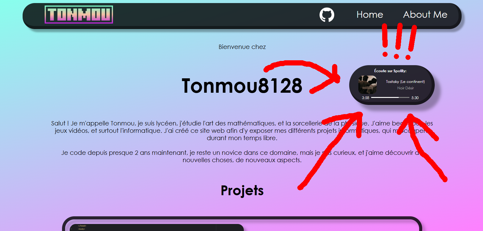 J'ai réussi à afficher la chanson que j'écoute en direct sur la page d'accueil. C'était un peu compliqué, heureusement que ChatGPT m'a aidé ^^'... Mais en gros le principe c'est que j'héberge sur un serveur gratos Vercel une API qui envoie un json avec quelques infos sur la musique en cours. Comme Vercel comprend que c'est une API, il donne pas le code JS et je peux garder le token caché. Le site principal va juste faire une requête sur cette API Vercel, et le tour est joué !